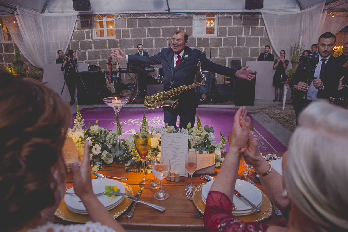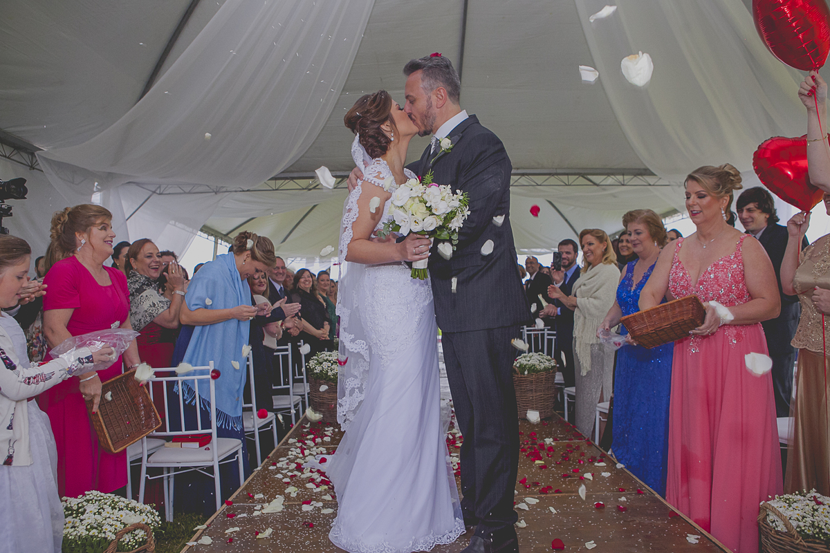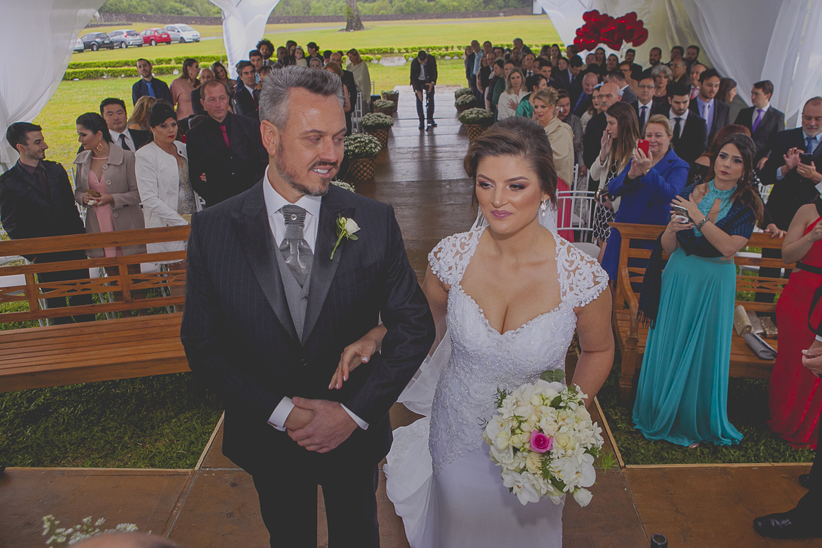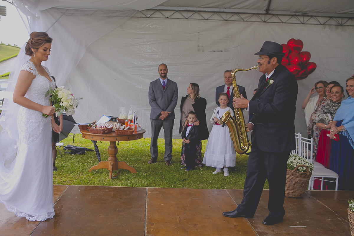 Ao som de sax, do renomado músico Caxiense Adão Cislaghi, que por sinal é o pai da noiva, os momentos de juras e trocas de carinho se tornaram a marca registrada deste lindo casamento.
